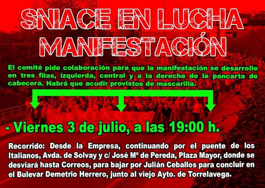 La manifestación convocada por el comité de empresa de Sniace en Torrelavega se realizará formando tres filas y los asistentes deberán acudir con mascarillas como medidas de precaución frente al coronavirus.