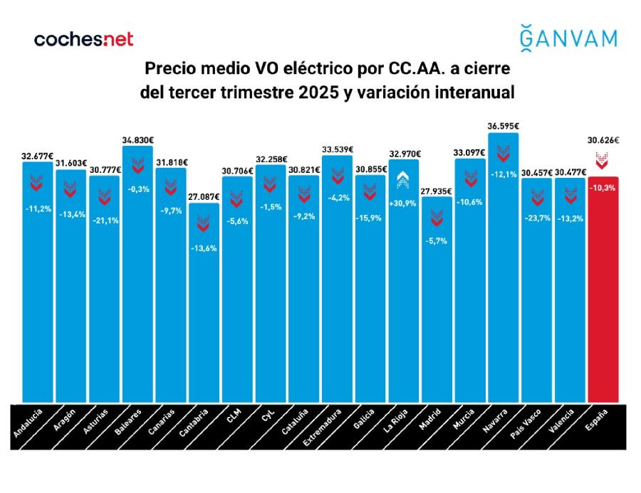 Los descensos en el precio medio del coche eléctrico de ocasión se extienden a prácticamente todas las comunidades autónomas. Las bajadas más pronunciadas se registran en el País Vasco (-23,7%), Asturias (-21,1%), Galicia (-15,9%), Cantabria (-13,7%) y Valencia (-13,2%).