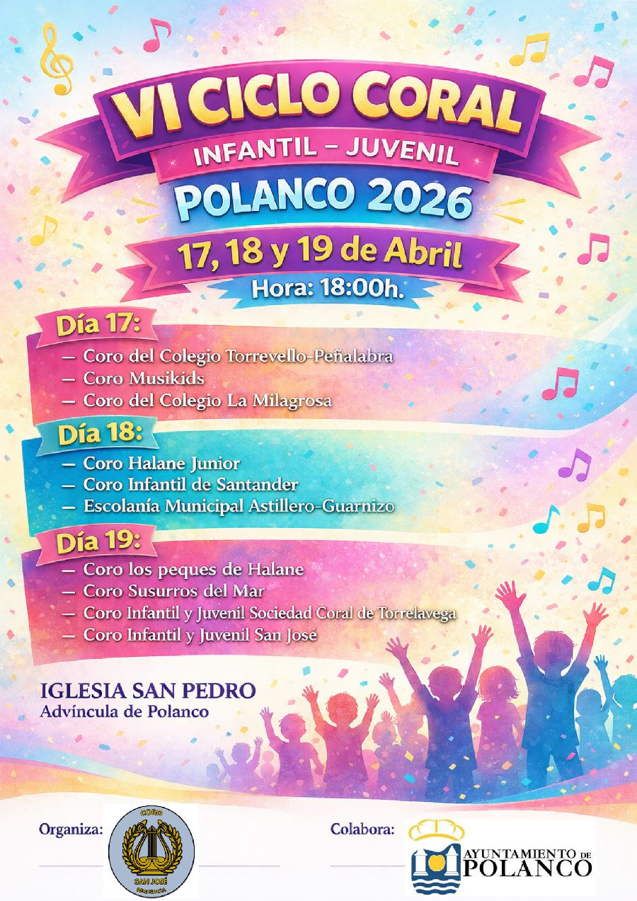 Diez coros infantiles y juveniles de varias localidades de Cantabria participan, del viernes 17 al domingo 19 de abril, en el VI Ciclo Coral Infantil-Juvenil de Polanco, que tendrá lugar en la Iglesia de San Pedro Advíncula, las tres sesiones con inicio a las 18.00 horas.