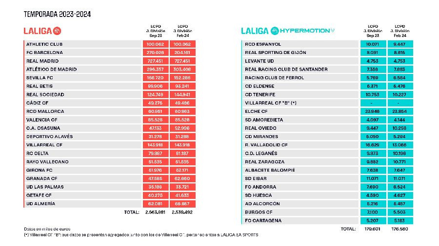 El límite de coste de plantilla deportiva es el importe máximo que cada club puede consumir durante la temporada 2023/2024 tras el mercado de verano e invierno, y que incluye el gasto en jugadores, primer entrenador, segundo entrenador y preparador físico del primer equipo, además del gasto en filiales, cantera y otras secciones (plantilla no inscribible), según se define en el Artículo 38 de las Normas de Elaboración de Presupuestos.