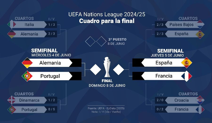 Un elenco de selecciones de primer nivel europeo que bien podrían copar las últimas fases del Mundial del próximo año. De hecho, la semifinal entre España y Francia, además de ser la reedición de la vivida en la pasada Eurocopa, mide al segundo y tercer clasificado del ránking FIFA de selecciones, mientras Alemania y Portugal también forman parte del 'Top 10', décima y séptima, respectivamente.