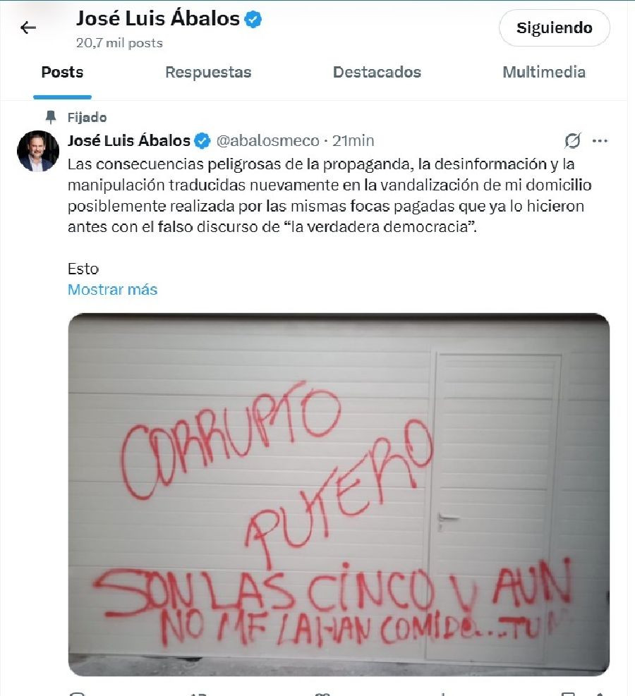 En la red social 'X', Ábalos ha publicado una foto de la fachada de su domicilio particular con una pintada en rojo donde se le llama "corrupto" y "putero", y se hace un juego de palabras ofensivas con aquellas palabras de Pedro Sánchez tras una comparecencia vespertina: "Son las cinco y aún no he comido".