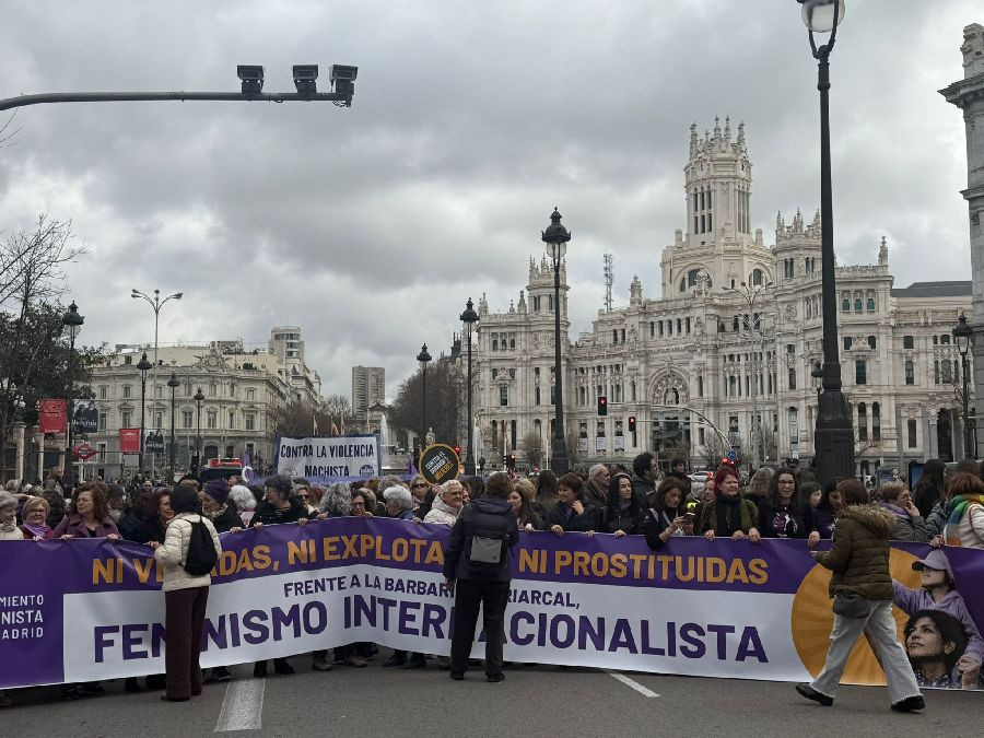 Pasadas las 12:15 horas han partido desde la Plaza de Cibeles para defender los derechos de las mujeres tras una pancarta bajo el lema `Frente a la barbarie patriarcal, feminismo internacionalista: ¡Ni veladas, ni explotadas, ni prostituidas!". Previamente, manifestantes con banderas de España han pasado por Cibeles, lo que ha provocado gritos de "fuera fascistas".