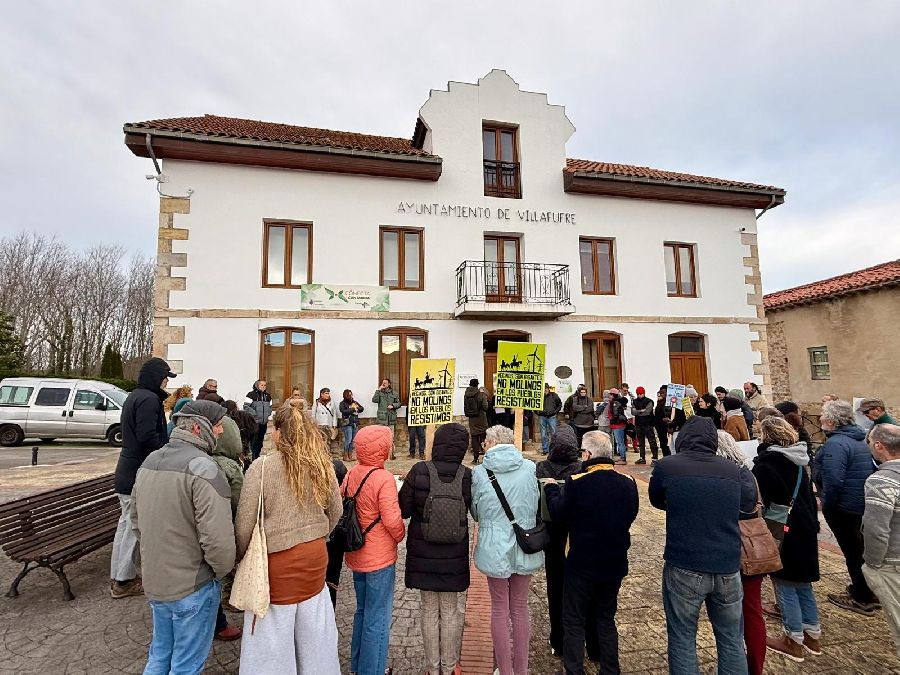 Medio centenar de personas se han reunido este viernes ante el Ayuntamiento de Villafufre, convocados por la plataforma Son Gigantes, para hacer visible el rechazo a los polígonos eólicos Astillero I y Astillero II tras cerrarse esta semana el plazo para presentar alegaciones.