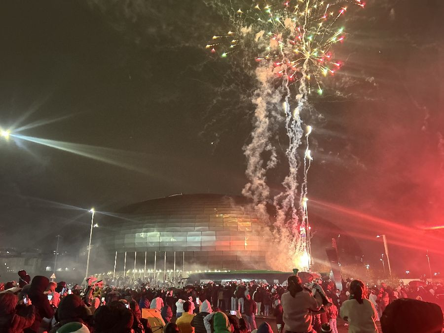 El autobús del Racing llega arropado por los gritos de los seguidores, entre fuegos artificiales