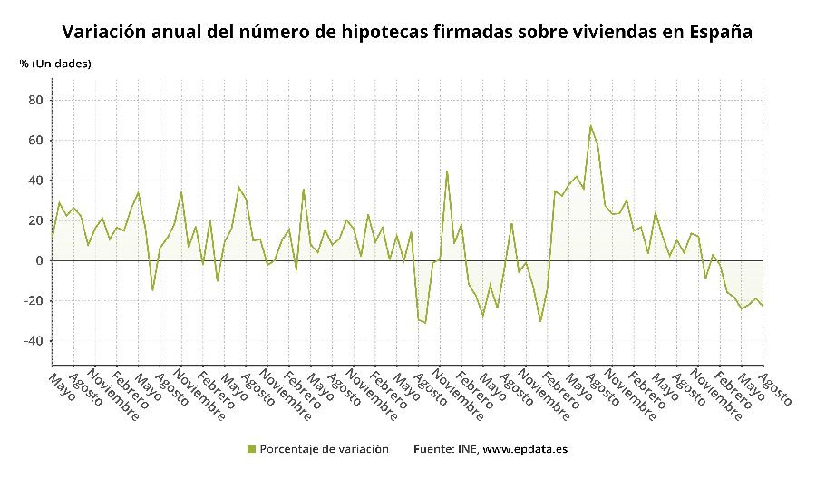 Con el descenso interanual de agosto, la firma de hipotecas sobre viviendas encadena siete meses de tasas negativas, aunque la de agosto ha sido más pronunciada que la registrada en julio (-18,8%).